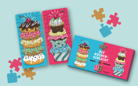 Egal ob du Donuts oder Cupcakes bevorzugst: Dieses Duell wird garantiert kein Zuckerschlecken! Die Schachtel enthält zwei zuckersüße Puzzles à 70 Teile. Wähle eines der beiden Motive aus und gib alles, um dein Puzzle vor deinem Gegner fertigzustellen. Nur wer zuerst alle Teile zusammensetzt, kann sich das finale Teil sichern, das beide brauchen, um ihr Motiv zu vervollständigen. Das außergewöhnliches Spielprinzip und die kurze Spieldauer versprechen jede Menge rasanten Puzzlespaß.